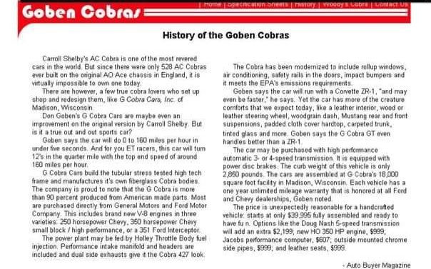 I own the Goben cobra posted on craigslist.if anyone else needs pictures or more info call or text me at 951.329.6870. my name is Larry salcido. And I can send you pictures if you are interested in the car. Enjoy life and happy new year everyone.