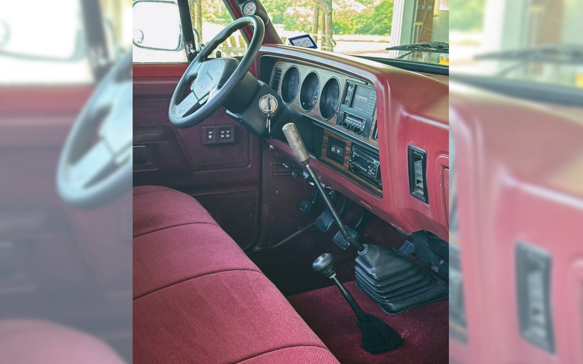 As posh as a truck should ever be, this Ram 350 has the proper red velour inside and has power windows and power locks. That’s downright decadent for a truck this hard-working, but if it were a 2025 version, it would probably have a latte foamer and who knows what else. The 5-speed manual should be a Getrag G360, which is actually a 4-speed with an overdrive, having a super low first gear, designated as L, followed by 1,2,3, and O for overdrive and R for, of course, reverse. Here’s a photo of a shift knob on another Dodge diesel truck, as this one is missing the original shift knob and the seller says the one on there needs to be rethreaded.