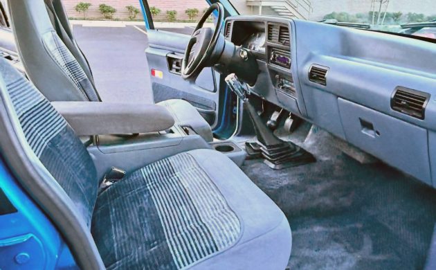 Ford called these great-looking and optional sport bucket seats “Crystal Blue,” and they look perfect. The whole interior looks perfect to me. I noticed a couple of dings on the exterior and a hint of rust on the bottom of the hood right above the left headlight, but I don’t see a flaw inside. The most flawless part is that the 5-speed Mazda-sourced M5OD-R1 transmission wrangled by the long shifter on the center hump next to the transfer case lever.