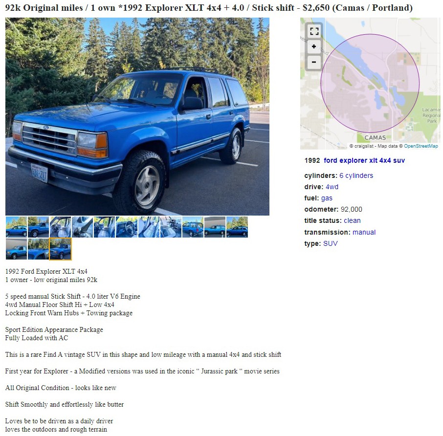 How is it possible to get a one-owner Ford Explorer XLT 4×4 with a 5-speed manual and fewer than 100,000 miles for just $2,650? Anyone lamenting vintage vehicle prices in 2025, or not even vintage, all vehicle prices lately, this one is for you. The seller has this bright blue (Brilliant Blue?) 1992 Ford Explorer XLT 4×4 5-speed posted here on craigslist in Camas, Washington, and they’re asking a mere $2,650. Here is the original listing, and thanks to Barney for the tip!