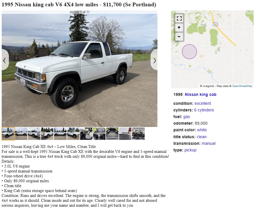 The other great part is seeing the VG30E fuel-injected SOHC V6 with 153 horsepower and around 180 lb-ft of torque when new. Backed by the 2-speed transfer case and 5-speed manual, sending power to all four wheels when needed, the seller says this truck has 89,000 miles, and it runs and drives “excellent,” and everything works as it should. You could do a lot worse with your $11,000 than owning this good-looking Nissan 4×4. Have any of you owned a similar one?