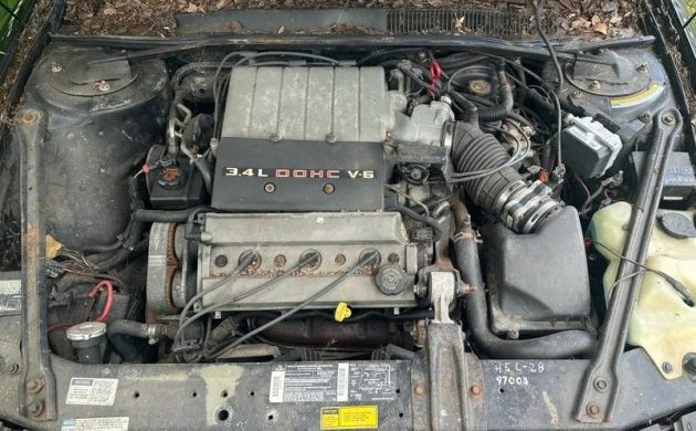 If the body is solid (a dubious proposition, given that unless the owner put it away every winter it would have been driven during PennDOT’s peak years for calcium chloride use, combined with the fact that they’ve allowed the car to sink into the mud to the point that the underside is now lying on the ground), unless it can easily be determined that the current 3.4 DOHC still has excellent compression (no valve, head, or piston damage), the prudent course of action would likely be a 3800 swap, or maybe even an LS4, as the 3.4 was a low volume option, and parts for low volume GM engines of this era tend to be hard to find.