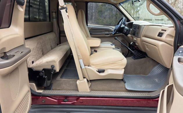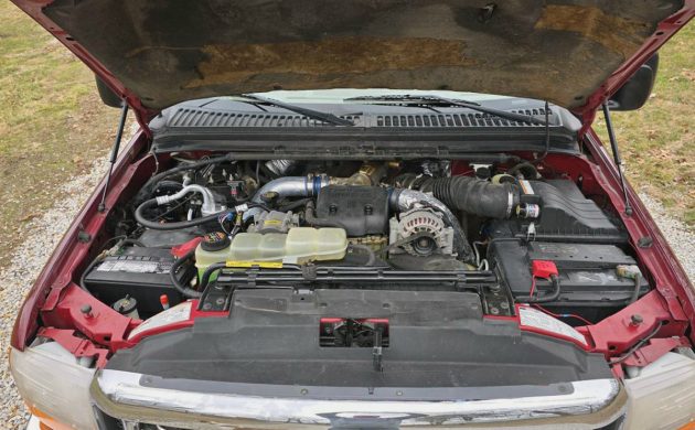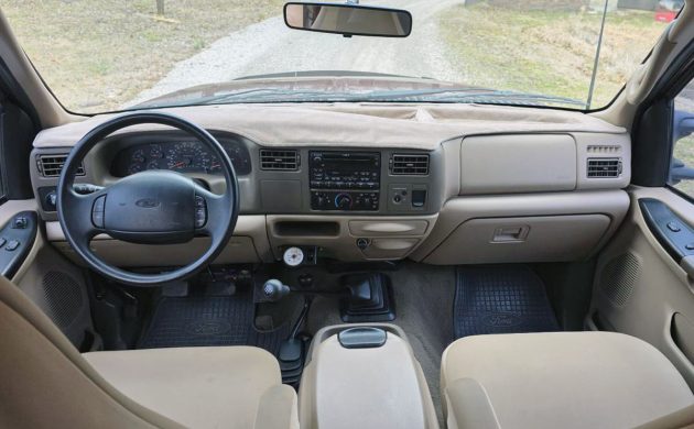 This photo shows really the only cosmetic things I’d work on here. The headlights are a bit (lot) hazed, but that’s a fairly easy fix. The underside of the hood is either showing some fibers from a hood pad or some surface rust. Either way, it should also be a fairly easy fix. The big deal here is Ford’s 7.3-liter Power Stroke diesel, their version of the Navistar T444E fuel-injected V8, which was rated at 235 horsepower and 500 lb-ft of torque. Sent through a two-speed transfer case and a 6-speed manual to all four wheels as needed, the seller says it starts, runs, and shifts perfectly, and I believe it. I would love to have this one. How would you use this F-350 4×4 diesel?