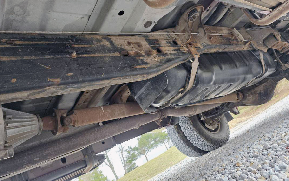 The SuperCab (extended cab) configuration is exactly how I’d spec this truck, with its 158″ wheelbase. Also, the color is beautiful, and the duallys are nice for hauling duties, which clearly this truck was made for and used for. You can see the gooseneck ball in the center of the bed, and this would be the ultimate trailer-hauler for driving all of my vehicle finds back home. I mean, if there were any… (wringing hands). Did I mention there is “no rust” on this beauty? Here’s one of the underside photos. As solid as Sears used to be when there was a Sears. Kudos to the seller for including so many great photos in a craigslist ad; that’s unheard of.