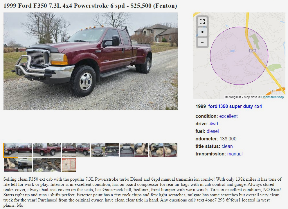 “Deer alerts? We ain’t got no deer alerts! We don’t need no deer alerts. I don’t have to show you any stinkin’ deer alerts!” To misquote the man with the gold hat in Treasure of the Sierra Madre. Looking at the meat grinder-like front bumper guard on this 1999 Ford F-350 SuperCab 4×4 Diesel 6-Speed pickup, yeah, you don’t need no stinkin’ deer alerts. This big bruiser is posted here on craigslist in West Plains, Missouri, and the seller is asking $25,500. Here is the original listing, and thanks to Jack M. for the tip!