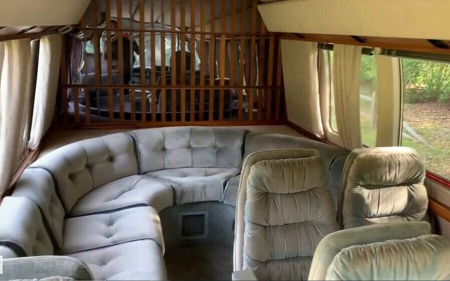 The Funeral Coach allows up to 14 family members to travel together in a living room type setting. There is a rear hatch that holds up to 20 baskets of flowers and the through-compartment discretely holds the casket. The driver’s area is pretty typical for a motorhome of this generation.