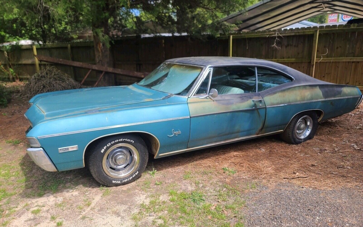 04/07/2023: One of the most successful cars of the 1960s was the full-size Chevrolet Impala. It topped the sales charts in 1965, even besting the new Ford Mustang, although they applied to different audiences. This 1968 Impala in the sleek fastback body style is numbers matching, but it’s going to need an extreme makeover to recover some of its spent youth. This classic Chevrolet is available on eBay in North Augusta, South Carolina.