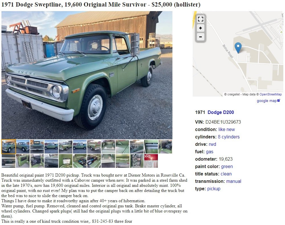 I can’t believe there are still vehicles like this 1971 Dodge D200 pickup hiding out there in the wild. This truck looks like it’s had a nut-and-bolt restoration, but it’s all original, believe it or not. It’s wearing all of its original paint, having been stored in a farm shed in the late 1970s. The seller has it posted here on craigslist in Hollister, California, and they’re asking $25,000. Here is the original listing, and thanks to T.J. for the tip!
