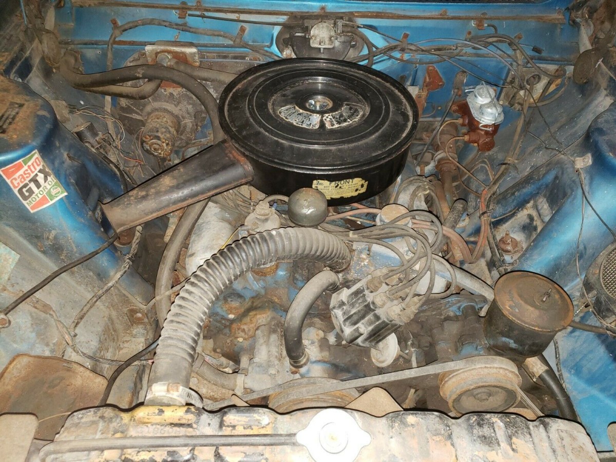 The seller acquired this Rebel from a family friend of the original owner in Pennsylvania (note the license plate). It wears its correct Caravelle blue paint but there’s no indication if its original or a repaint. While the seller indicates the car to be solid overall, there is corrosion apparent in the quarter panels and floorboards and some evidence of prior patches are there. And there’s a nice dent in the driver’s side front fender. The convertible top has no canvas remaining, which means there was little there to protect the black interior over the years.