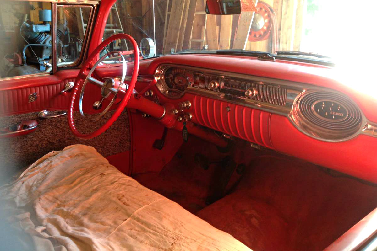 With a still vibrant red interior, it looks as if this car spent a lot of its time indoors. Aside from some minor stains on the floor, and a mice chewed bench seat buffet, this Olds has a mighty clean interior. The level of originality is easy to appreciate, and the homogeneous shade of red is also a delight, versus varying shades of red from sun exposure. A photo of the engine has not been provided, but the 324 cubic inch “Rocket” V8 is a runner, and recently had the carburetor and fuel pump cleaned and rebuilt, and the automatic transmission has also recently been serviced by a transmission shop. Driving, shifting, and stopping as it should, this Olds is that much more desirable for its healthy condition.