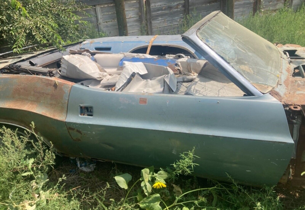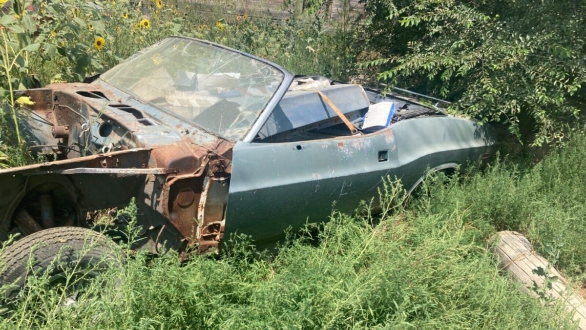 What’s left of the ’70 R/T drop-top is rare in that less than 700 of them were produced with the 383 engine. A V8 ’71 rag-top saw more assemblies, but also rarely at under 1,800 copies. But what survives of either car is hard to sort out from the photos provided as they look like one shell and a bunch of parts sitting out in the weeds.
