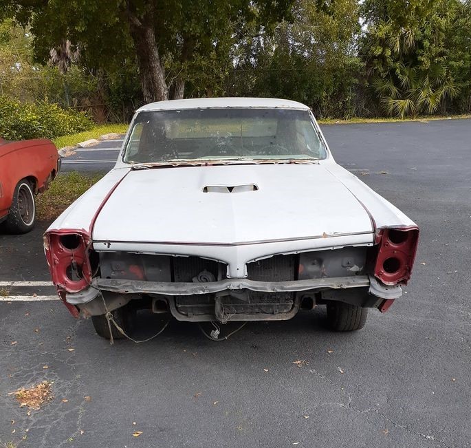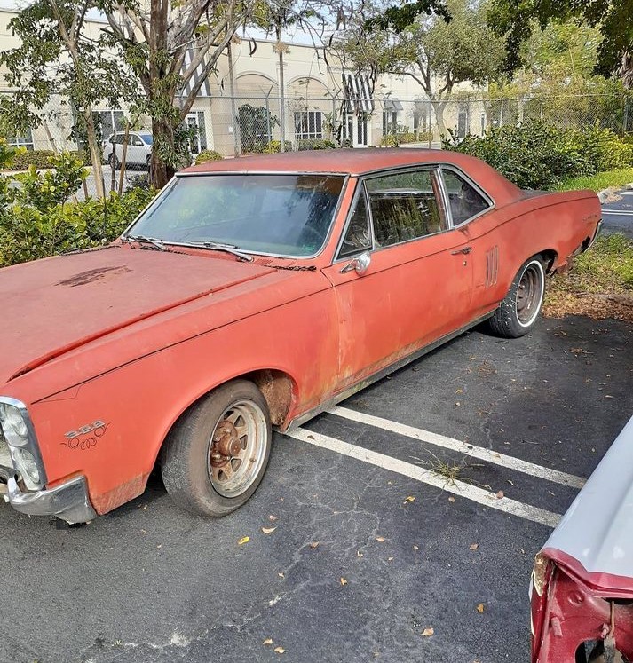 Finished in primer grey is the ’67 GTO which should have had some version of a 400 cubic inch V8 under the bonnet. But we don’t know if there is any engine there now or if the 4-speed is still there either. This car may have been painted red when new and the passenger compartment looks to be filled with various parts. There is rust present in this auto, starting with the panel where the windshield wipers would be. This would have been one of 65,176 units produced in ’67, making it less rare than the Lemans, but potentially more desirable.