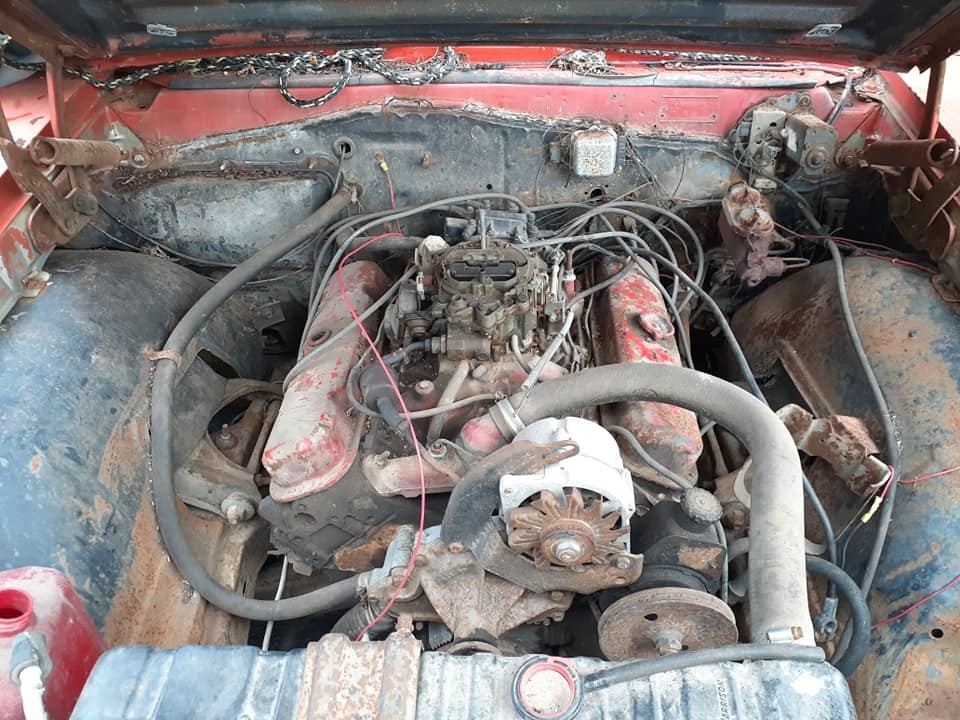 The faded red coupe (formerly blue) here is a ’67 LeMans sport coupe and the insignia on the front fenders indicate the engine under the hood is Pontiac’s 326 cubic inch V8. This car was produced in smaller qualities than the pillarless hardtop, so it would be one of 10,693 that Pontiac cranked out in 1967. We assume the car hasn’t run in a while, we don’t know what it will take to change that, and the sheet metal doesn’t seem to have any gaping issues (i.e., rust).
