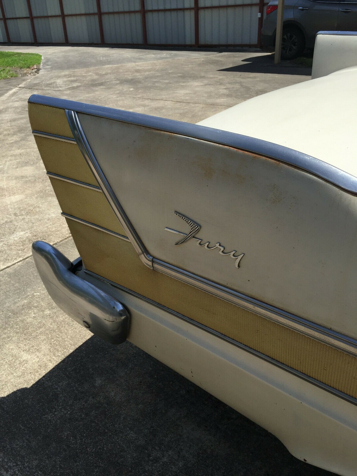 No such thing as a ’57 Fury convertible or a purple Fury. It may have been a Belvedere but not a Fury. Two door hardtop only in Eggshell White with gold trim.