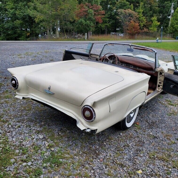 Though it still looked like its 1955-56 predecessors, the ’57 T-Bird was a more streamlined version of the automobile. A 312 cubic inch V8 became standard and the one in the seller’s car was rated at 245 hp when new with a 4-barrel carburetor. The title, dated in 2022, says that this ’57 Ford has just 46,000 miles on it, so it wasn’t necessarily worn out when it went into storage for reasons not mentioned. Overall, it looks solid though we’re told there is a bit of sheet metal rust here and there. The top has been “repainted” but with a vinyl material that looks good but isn’t nearly original, if that’s important to you.