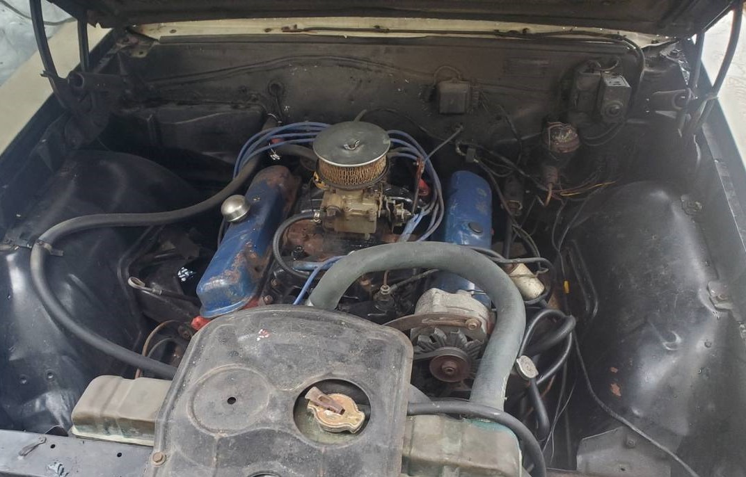 I spy……. some 2 bbl carb parts in the trunk! Wonder if a tri-power intake is buried in the trunk somewhere? This looks like a very solid GTO! The interior isn’t that bad either and if it is a ’67 400 it should have the “670” heads, valuable to Pontiac nuts (myself included!). Get it runnin’, find a Muncie (or keep the auto), new carpet set, throw some speakers in the door panels since they’re already cut and go have fun.
