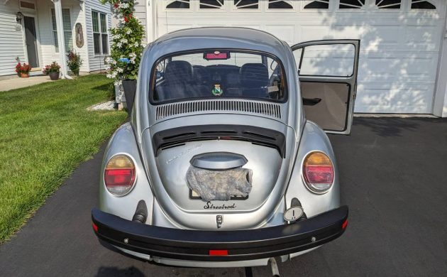 Good eye, April. This car should have the “elephant foot” tail-lights that have a face perpendicular to the road. The car shown has aftermarket taillights. The engine rain deflector was a dealer option and the late model Superbugs had a cover for the space behind the seats. Depending on where you live, you might have issues registering because the fuel injection was removed – which came from the factory with a catalytic convertor and single exhaust. Clearly as it is, it would violate federal smog rules.