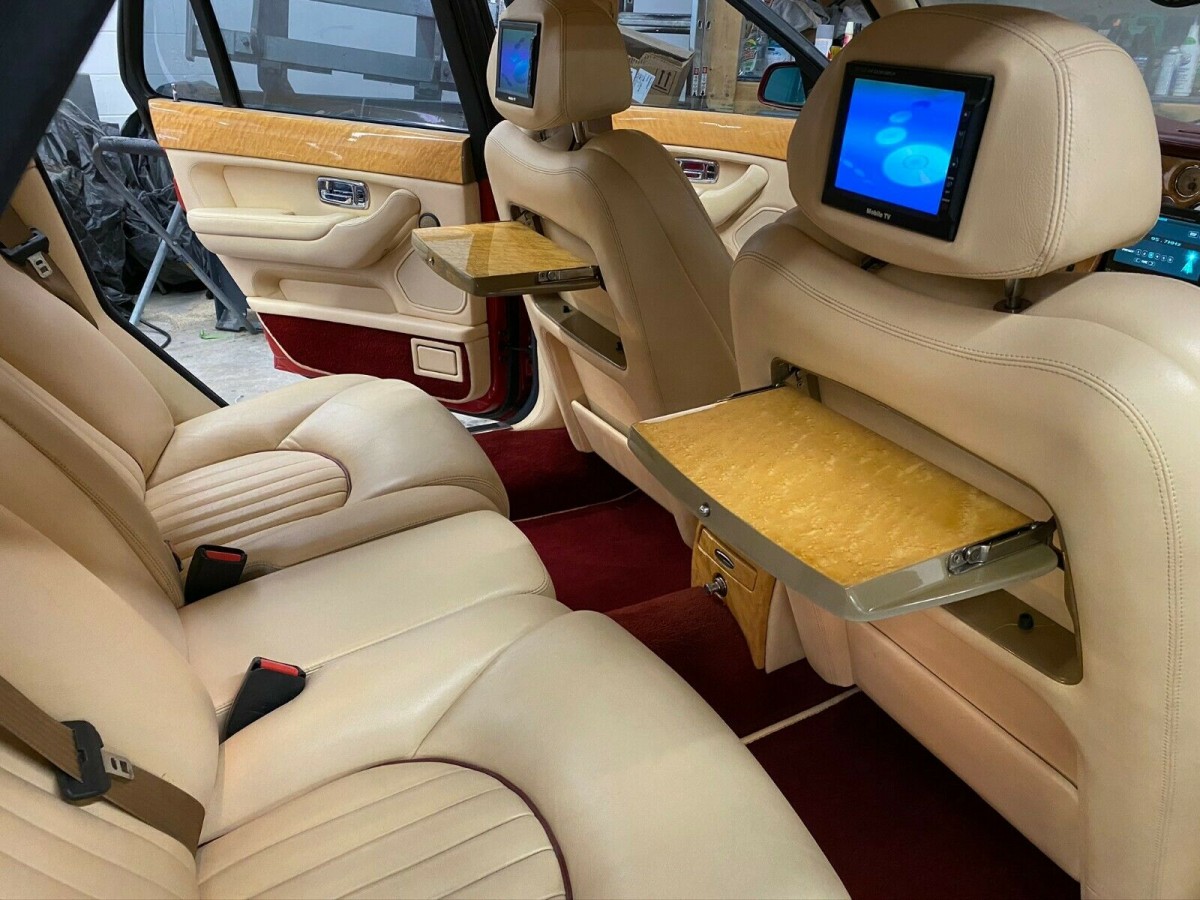 The in-progress bodywork above would suggest some level of accident repair was underway before the bills stopped being paid, but the seller doesn’t elaborate as to how it ended up there. The interior looks decent still, but the televisions mounted in the rear headrests suggests an owner who may have prioritized bling over mechanical integrity. The picnic tables are still in nice shape and the seats and carpets look pretty fresh yet, and certainly decent enough for a luxury car with over 60,000 original miles. The Bentley, at the moment, does not run.