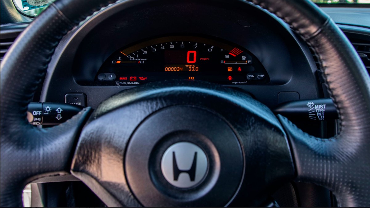 Choosing a Honda over the Mazda did come at a cost. The S2000 was fully 25% more expensive than the range-topping MX-5 Miata SE. However, the owner would want for nothing in the comfort and luxury stakes. Besides air conditioning and dual airbags, the interior is equipped with power windows, power locks with remote entry, push-button engine start, a power top, leather upholstery, a leather-wrapped wheel, cruise, and an AM/FM stereo radio/CD player with remote control. It is no surprise to find that the interior of this car is perfect. After all, it really hasn’t had the chance to cop any abuse in its 34 miles of use.