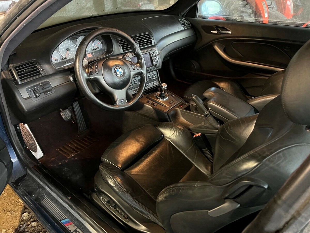 The seller purchased the M3 with a salvage title and the transmission still functioning enough to drive it as needed. However, the car went into the open shed you see it in currently and he never got back to it, noting that now it doesn’t select any forward gears and can only go in reverse. I have seen reports of the SMG cars seemingly being DOA and then a simple fix resolves the issue and it’s back in business. The seller notes it could be the gear position sensor as he can still hear the SMG pump priming, but he obviously hasn’t torn into it at any level to know for sure. The interior still presents well despite having almost 140,000 miles, and Mystic Blue Metallic over black leather is always a good combination.