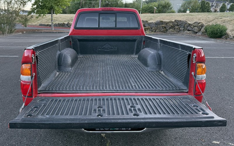 The interior looks perfect to me, not to mention the perfect five-speed manual shifter poking out there next to the two-speed transfer case shifter. My tiny Dodge D-50 Sport pickup can’t hold a candle to a nice truck like this Tacoma in any category. This one is much nicer, quieter, has much more leg and head room, plus the all-important space behind the front seats would be a dream. The bed has a liner in it, and I’m hoping it’s perfect under that plastic liner.