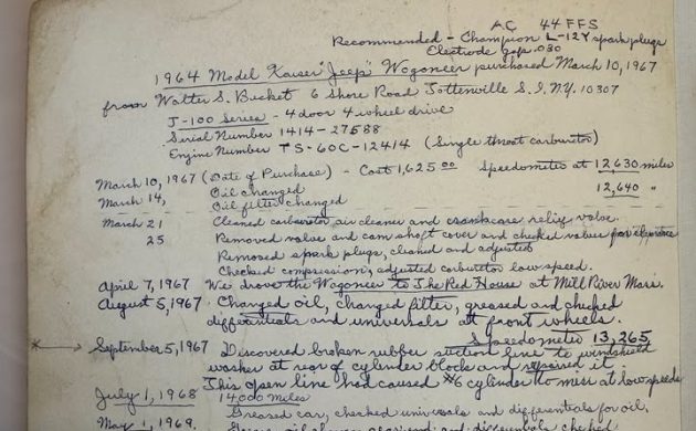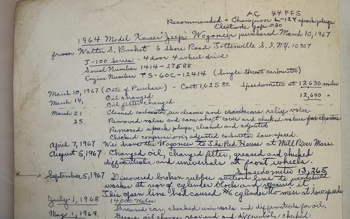 The Jeep will come with Grandpa’s “handwritten service log,” which covers 1967 to 1976 and mentions that the Wagoneer was driven to Mill River, Massachusetts, almost immediately after it was purchased.