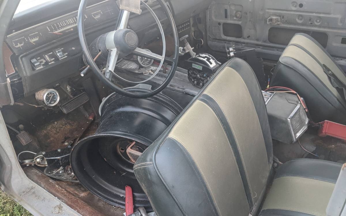 The interior is said to have originally been two-tone green and the original upholstery is still intact, although the door panels were stored inside the trunk and will need to be replaced. The console is cracked and the carpet has been the victim of rodent poop. The dashboard appears to be complete, with an aftermarket gauge mounted underneath and another one on the console.
