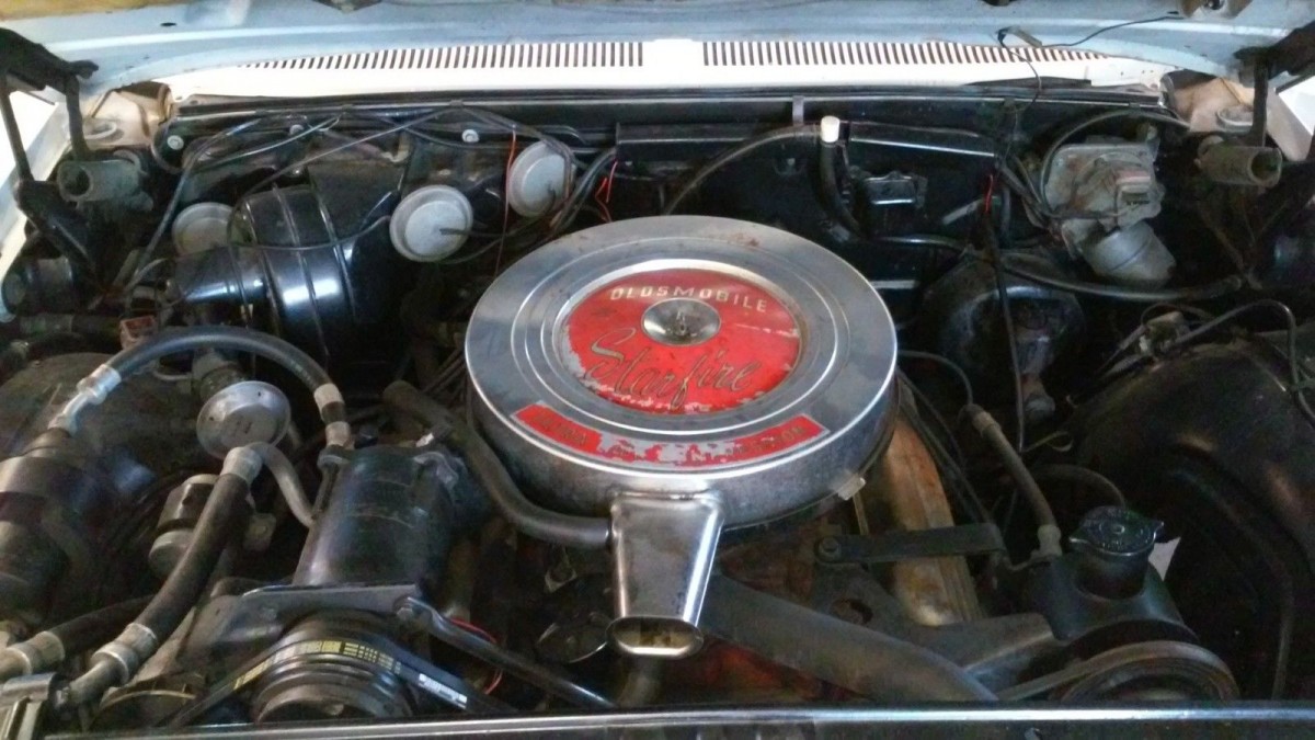 Very nice. Top of the line, and must have been targeted at fancy women, that notch at the bottom of the gas pedal was for high heels. In the mid ’60’s, when I was just starting to adore cars, the old man had a ’63 4 door 98. Very impressionable for a 10 year old. Once going somewhere, I noticed a ’63 Starfire. Way cooler than dad’s 4 door, and that silver stripe( back then, the color silver was not like it is today, and to see the stripe, looked like platinum to us. When he was looking for a different car, we hoped like heck, he’d come home with a Starfire, but alas, it was another ’65 4 door 98. It’s faded,but that sticker on the air cleaner said “Ultra High Compression”