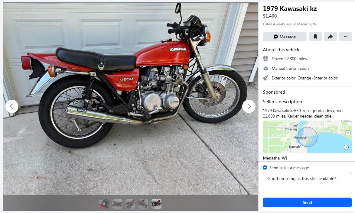 A 2022 Revzilla review referred to the 1979 Kawasaki KZ650 as a prince when it said, “Kawi’s king gets a prince.” As in, the king being the company’s king of the hill, the 900 Z1, introduced a few years earlier. This prince of a bike is listed here on Facebook Marketplace in Menasha, Wisconsin, and they’re asking $1,400. Here is the original listing, and thanks to Lothar… of the Hill People for the tip!