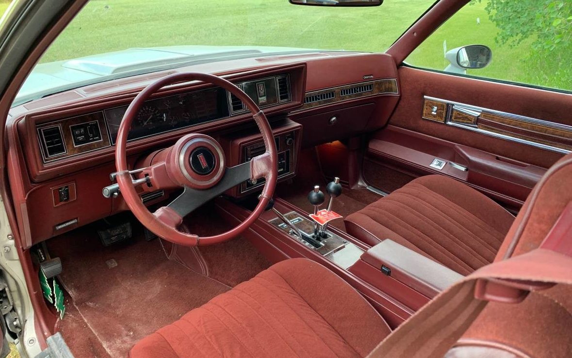 The hood is off by more than a shade. Really screams at you. Maple is white, this interior is burgundy. I had an ’81 Monte with the same interior color. 21k?, good luck!