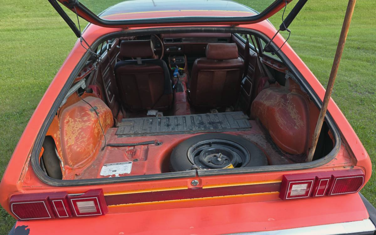 Canada, only 45 minutes north of Grafton, got the first Mercury Bobcats in 1974, and we received them a year later here in the U.S., in this 3-Door Runabout body style, and also the 2-door wagon and fancy 2-door Villager wagon, comparable to Pinto’s Squire woodie wagon. Speaking of the Pinto, they were offered from 1971 through 1980, and the Bobcat hung around until 1980 as well. You can see that this car needs some help. The seller shows one underside photo, and there’s a fair amount of heavy surface rust visible. An all-glass hatchback door was an option.