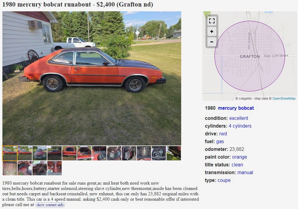 Grafton, North Dakota is a nice little town. With around 4,100 people, it has North Dakota’s 17th biggest population, believe it or not. It has a huge Marvin Windows plant, employing around 500 people, and is 45 minutes northwest of Grand Forks. Grafton has actual bobcats, but we now know there’s at least one Mercury Bobcat there. Although at this asking price, it may not be there for long.