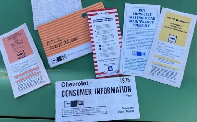 The interior also indicates that this is a low-mileage car. Based on this picture, the Vega has not a four-speed but rather the standard three-speed manual. Yes, you could still get a three-speed in a Vega in 1976 (I’m a little surprised, too). Surprisingly, there are no pictures of the engine posted, but the emission sticker tells us that this car has the standard one-barrel equipped “Dura-Built” 140-cubic-inch four, which produced 70 horsepower and was fed through a 2.92:1 rear axle ratio. (There is a video of the engine running, and it sounds good.) Chevy worked fairly hard in its sales materials to distance this engine from earlier examples in earlier Vegas; in an attempt to soften the car’s dubious reputation for reliability, the engine had a 5-year/60,000-mile limited engine warranty. Anecdotally, the later Vegas were of much better quality than earlier examples, but the damage was done.