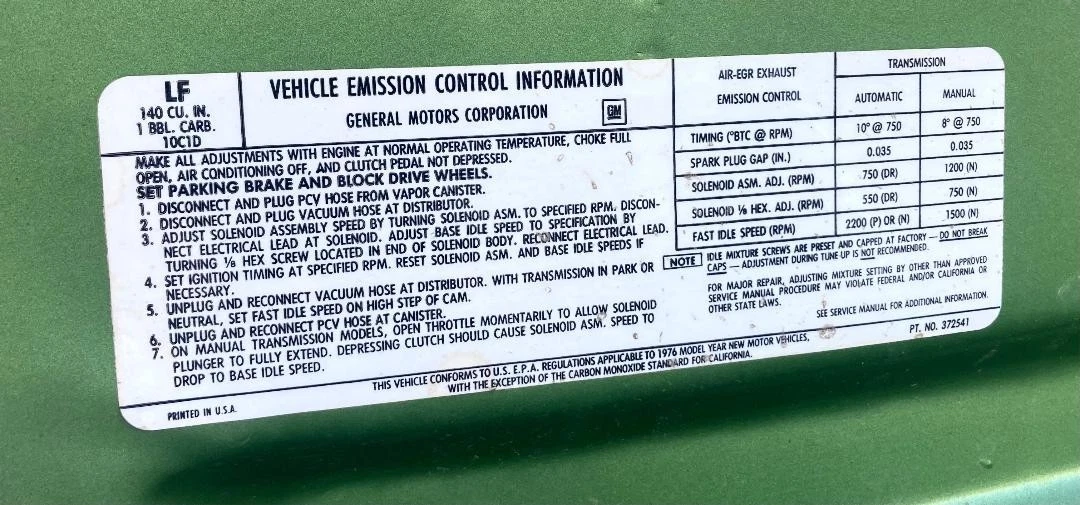 The interior also indicates that this is a low-mileage car. Based on this picture, the Vega has not a four-speed but rather the standard three-speed manual. Yes, you could still get a three-speed in a Vega in 1976 (I’m a little surprised, too). Surprisingly, there are no pictures of the engine posted, but the emission sticker tells us that this car has the standard one-barrel equipped “Dura-Built” 140-cubic-inch four, which produced 70 horsepower and was fed through a 2.92:1 rear axle ratio. (There is a video of the engine running, and it sounds good.) Chevy worked fairly hard in its sales materials to distance this engine from earlier examples in earlier Vegas; in an attempt to soften the car’s dubious reputation for reliability, the engine had a 5-year/60,000-mile limited engine warranty. Anecdotally, the later Vegas were of much better quality than earlier examples, but the damage was done.