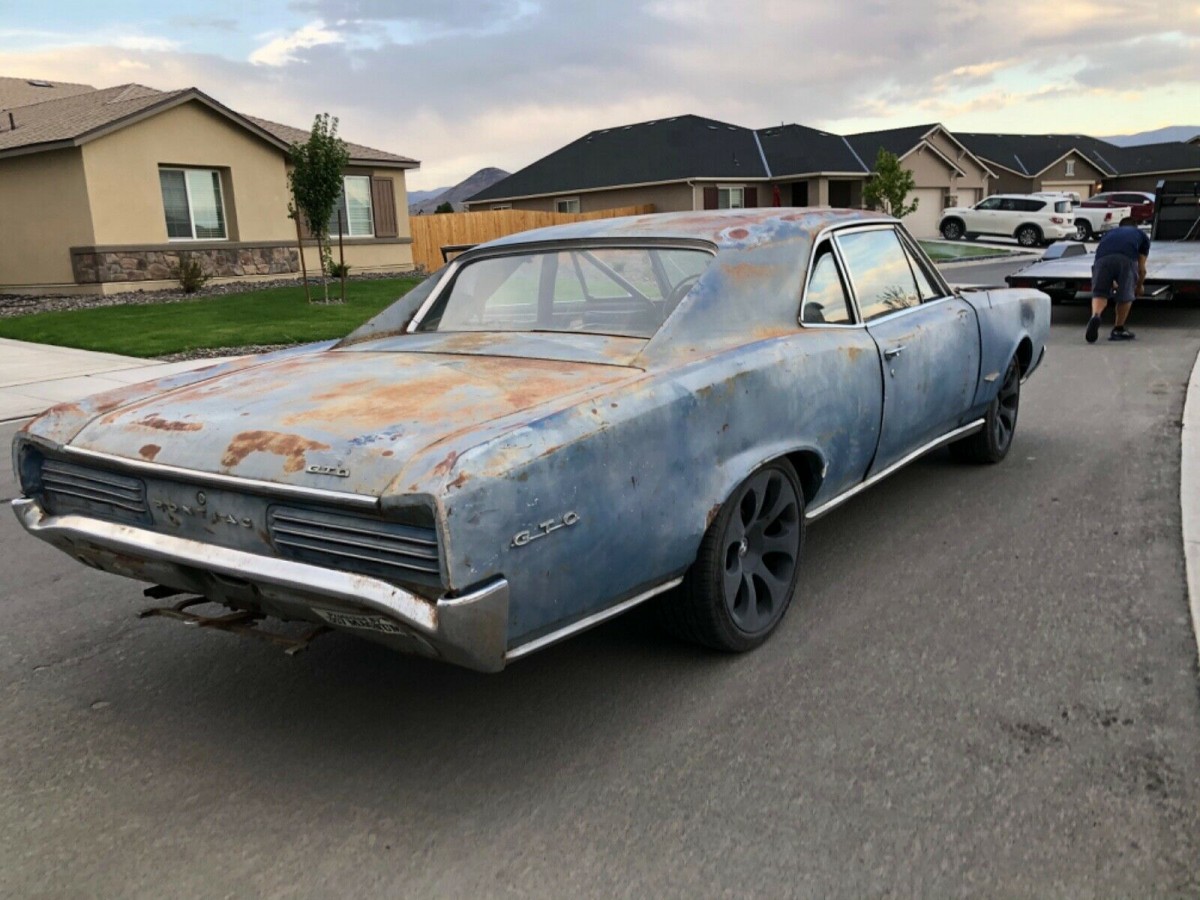 When I lived in California, I bought a 66 2dr hardtop GTO that had a 65 front end on it, an ice cream truck drivers seat, and a 326 engine with the 66 Tri-Power set on it. I found a car that was almost identical to this one that had been hit in the left rear quarter. I started leaving notes on it and bought it for $300. Swapped the front clip, took the seats out of the coupe and took both motors out. Had a junkyard haul away the coupe. Had the parts for both engines on shelfs in my garage in preparation to rebuild the 389.