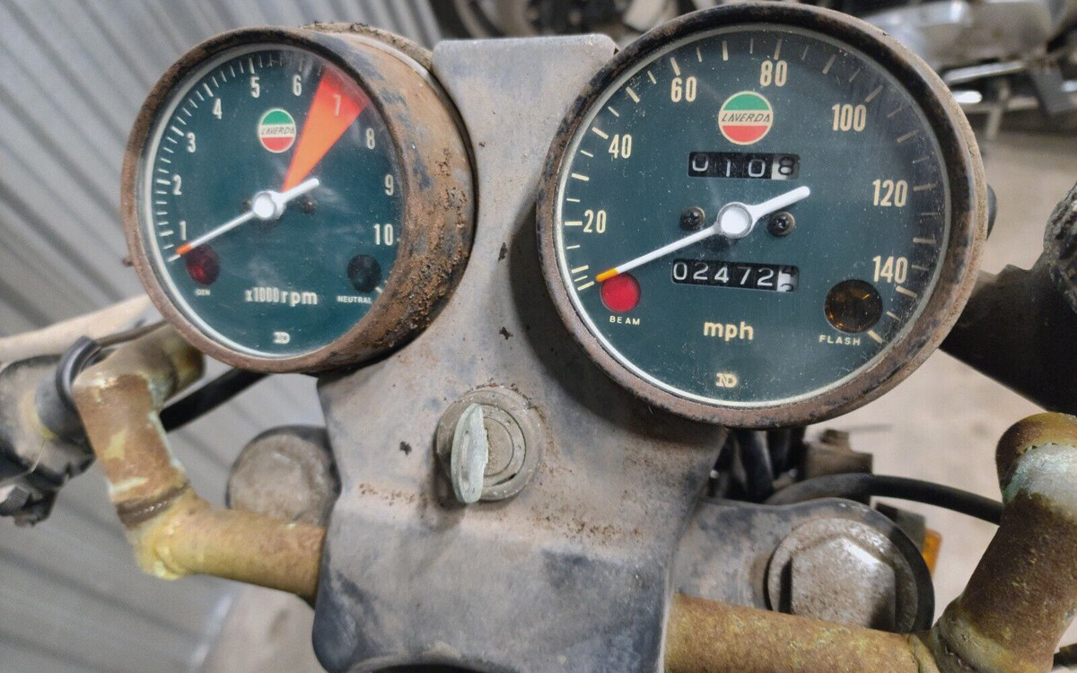 I remember Laverdas claim to fame was the sand cast engine cases. That, and they always had racy supermodels in provocative poses on the bikes. Again, tough sell in Beer City, and never saw one. In case some folks may not know what it was like growing up in the city that made the only American motorcycle, but other makes were strictly forbidden, ESPECIALLY Italian. I think, like all high end Italian machines, it WAS an awesome bike. Asian gauges and probably front forks to cut cost, I’m sure. Again, new, probably an exhilarating ride, like this, pretty sad.