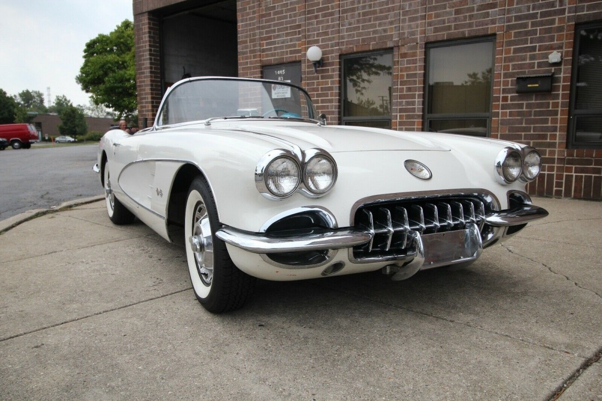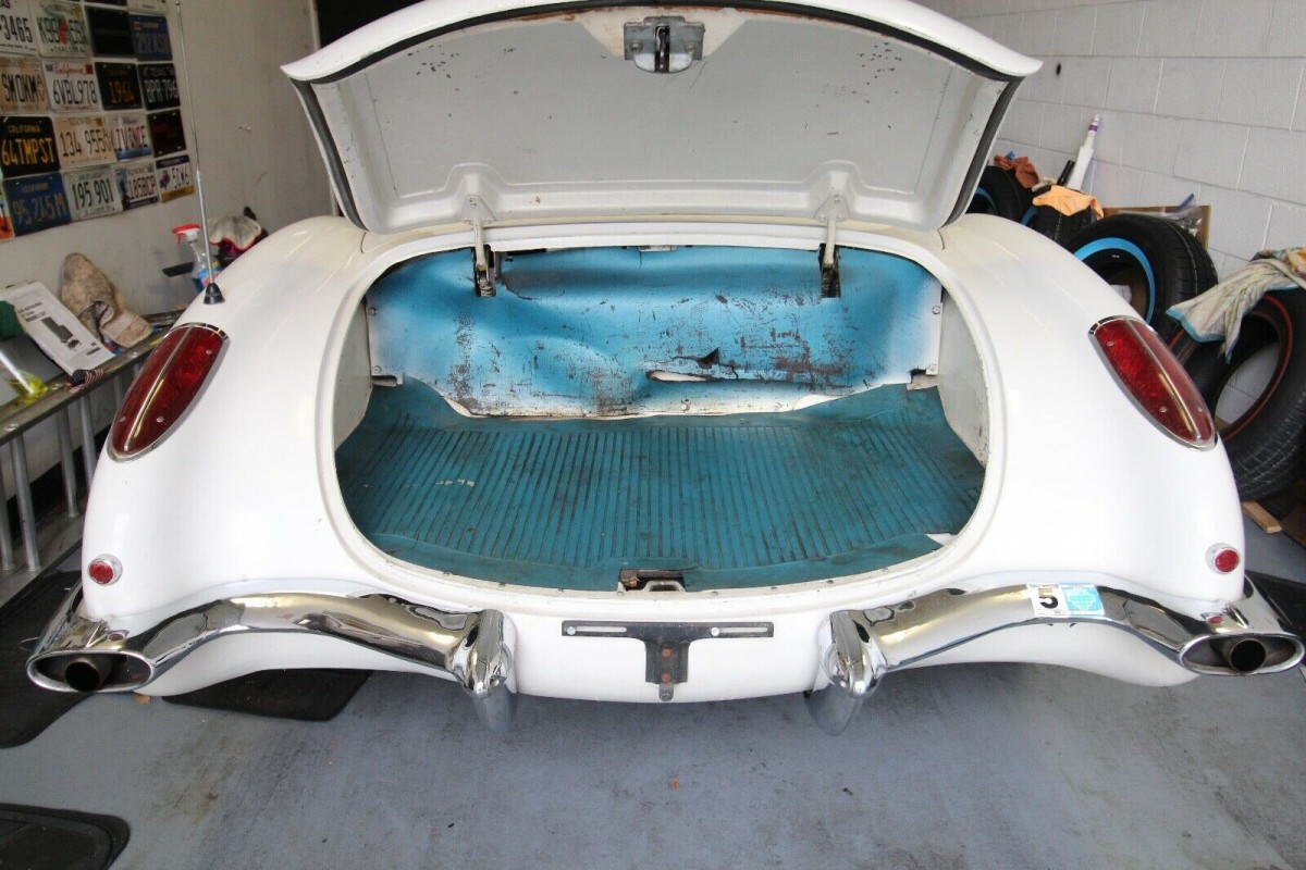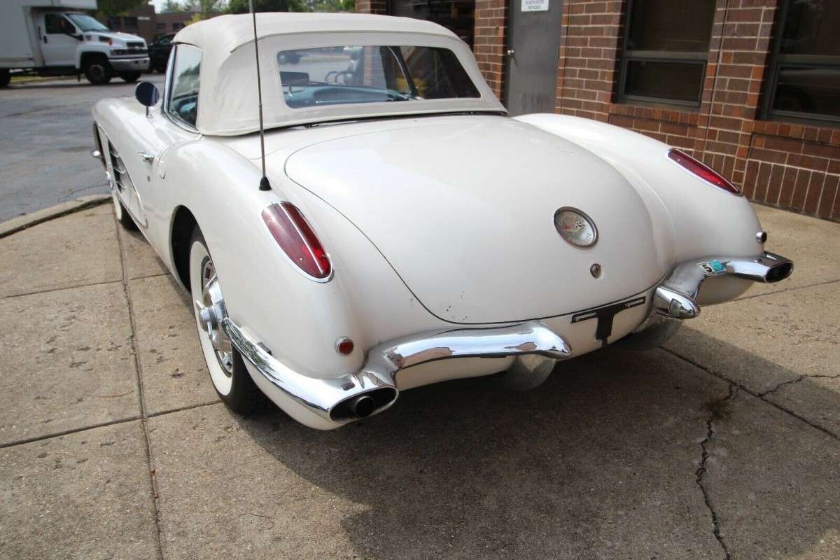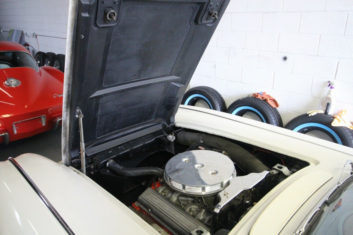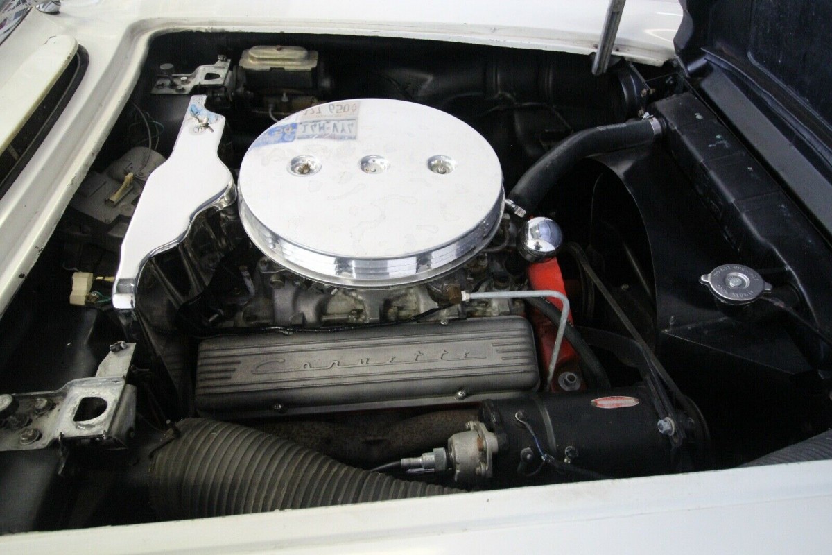 While there are a couple of non-original aspects to this Corvette, the panels and paint don’t fit into that category. The original Snowcrest White paint presents very nicely and has survived the past 60-years extremely well. This particular car is 1-of-3,354 cars in that year that were finished in this color. The owner says that the paint has very few chips and scratches, but that there are no signs of crack anywhere on the body. He supplies a number of photos of the Corvette’s underside, and it all looks to be clean and solid. The chrome, trim, and glass look extremely nice, while the white soft-top is also in very impressive condition.