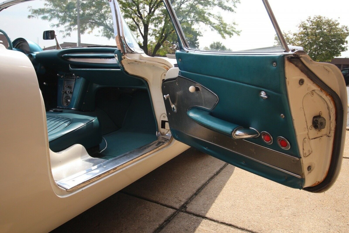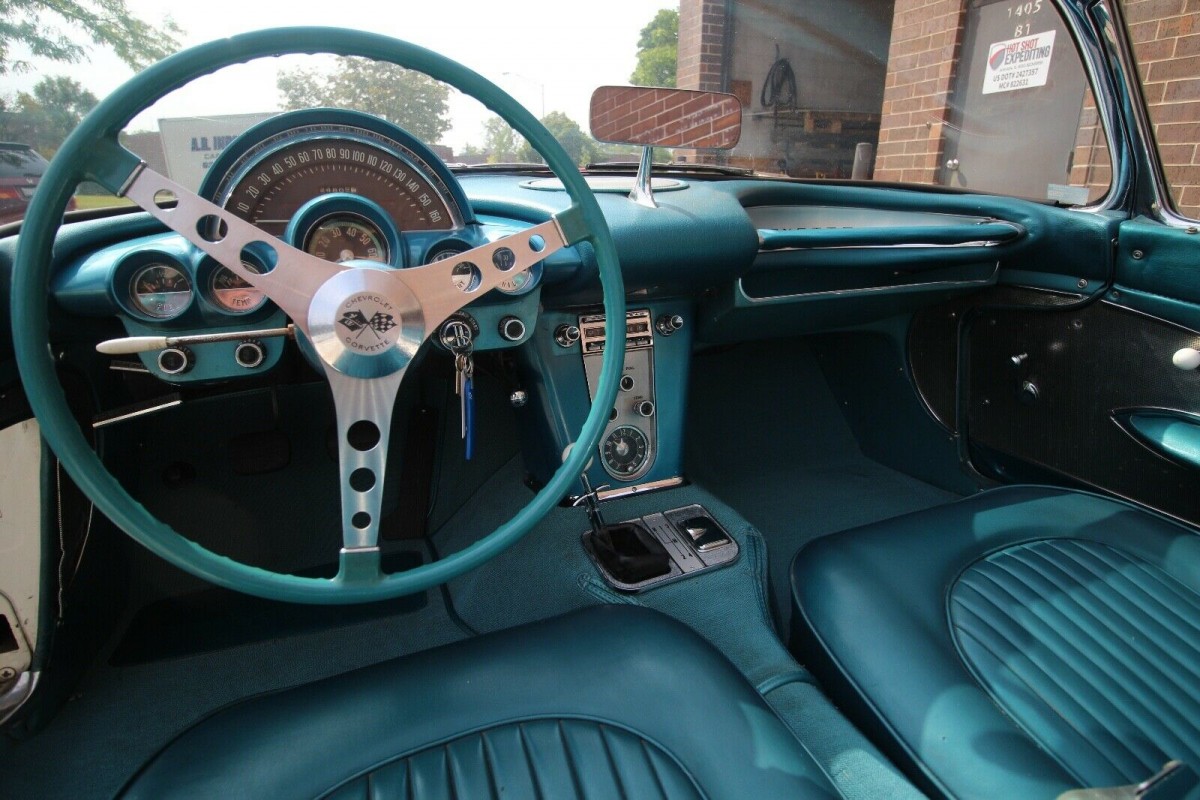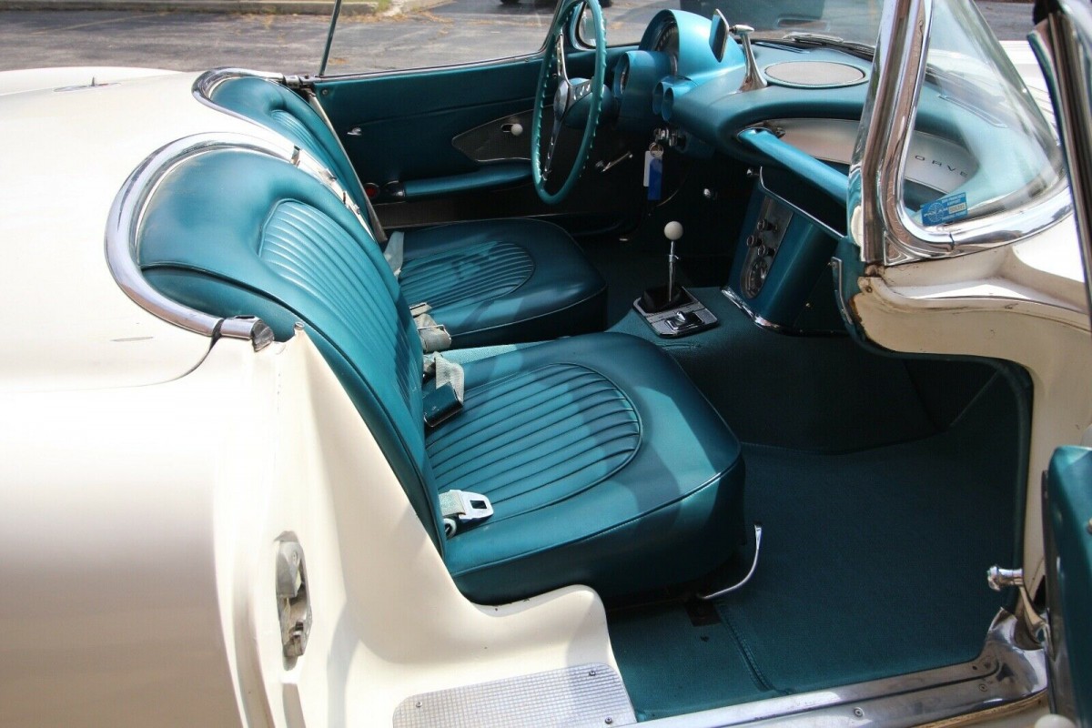 The original theme continues inside the Corvette, with the Turquoise trim being as it was when the car left the factory. It has survived in impressive condition and appears to be completely original. The 1959 model year brought some minor, but welcome, upgrades to the interior of the Corvette. This included concave lenses on the gauges to reduce glare, while the door handles and armrests were repositioned to improve comfort and ergonomics. The seats received a redesign to improve lateral support, and although they are not fitted to this car, sun visors were introduced as an option. Probably the single most significant improvement was the one made to the shifter. A T-Handle was added to provide a lock-out on reverse gear, preventing drivers from accidentally trying to grab that gear when their driving became a bit enthusiastic.