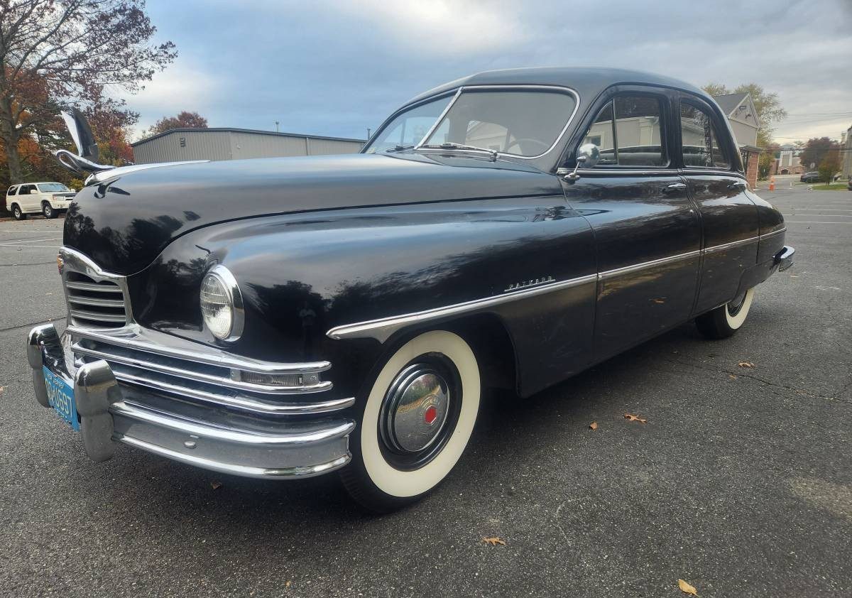 The Packard Eight was the base model and was offered as a 2-door Club Sedan, a 4-door Station Wagon, and a 4-door Touring Sedan. This one doesn’t have many options and is equipped with a 3-on-the-tree manual transmission. The seller describes the original black paint as “showing its age although it looks great from a few feet away.” Supplied photos show chips, scratches, and paint cracking in areas, but I’m not seeing any signs of accident damage or rust (the seller shares that the Packard was Ziebart undercoated and rust proofed back in the 70’s or 80’s). All that ’50’s-era brightwork upfront on the grille and bumper looks remarkable as does the large wraparound rear bumper on this black beauty. That large swan hood ornament certainly makes a statement and everything I’m seeing including the trim, badging, glass, tires, and wheel covers look very good.
