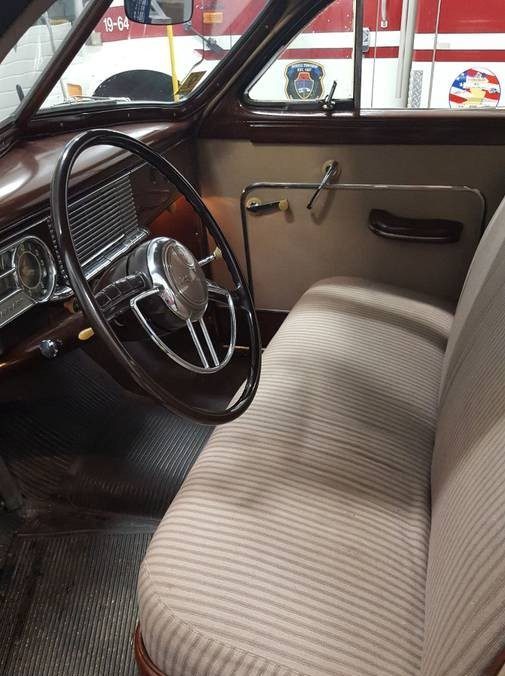 The faux-wood painted metal instrument panel and tops of the door panels compliment the tan and brown theme perfectly, and the gauges, chrome, steering wheel, and everything shown in the photos look remarkable.