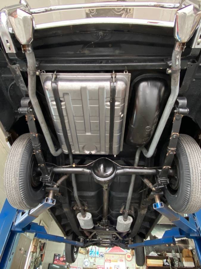 Some interesting features of the car include its big, wrap-around bumper guards, rare chrome exhaust tips, and optional wire wheel covers, said to be unique to 1955 models. Everything looks nice and tidy, although the upholstery on the front bench seat looks a tad stretched. The undercarriage is extremely clean, looking as though it has been detailed while the gas tank appears brand new. The tires look like the ones that would have been used in ‘55 and I hope those are reproductions and not 66-year-old-doughnuts.