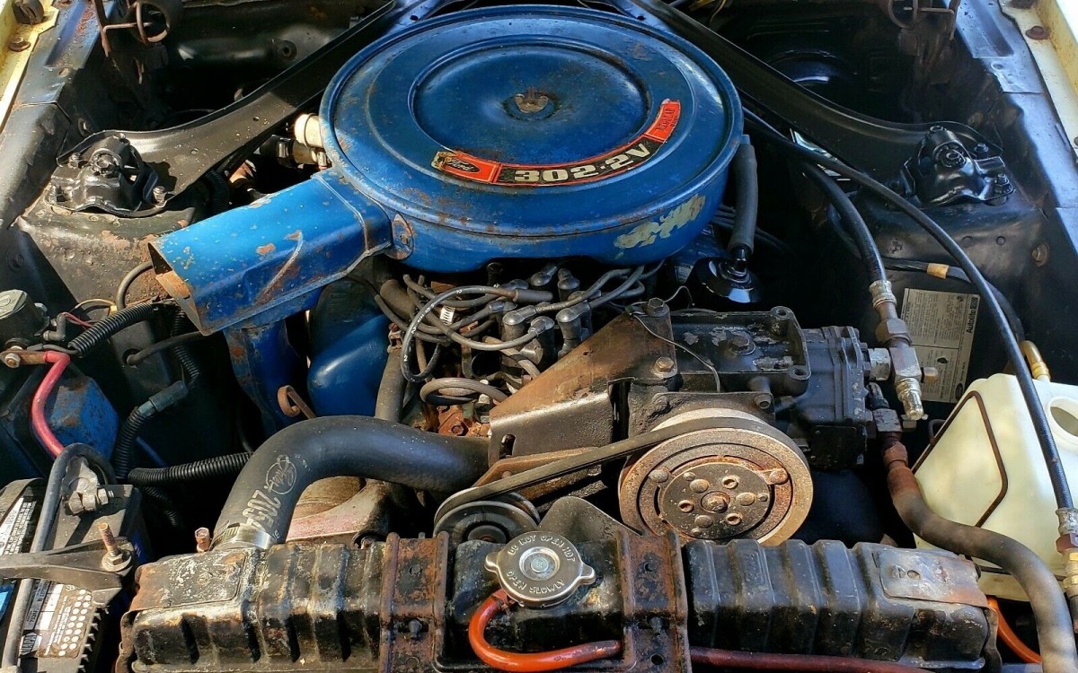 The Mustang is equipped with its original 302 cubic inch V8 and an automatic transmission. The seller includes a short video of the car driving and being started, and the 302 does fire right up and seems to be running well. You’ll especially enjoy some of the music in the video if you’re a fan of the band nicknamed the “Toxic Twins”. It wouldn’t take a lot to detail the engine compartment if the next owner chooses to do so, but personally I kind of like the unrestored look. The car has power disc brakes, power steering, and a working A/C compressor that is in need of revision.