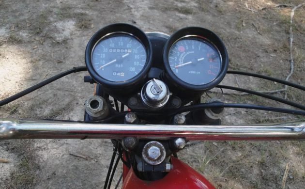 A Nippon Seiki 100-mph speedometer and a tach, that’s nice to see. This bike has just a tick over 2,500 miles, very low for a 53-year-old motorcycle. A big feature of some Kawasaki on/off-road bikes of this era was something called Hatta Forks, adjustable front forks that can be changed depending on the road or trail conditions.
