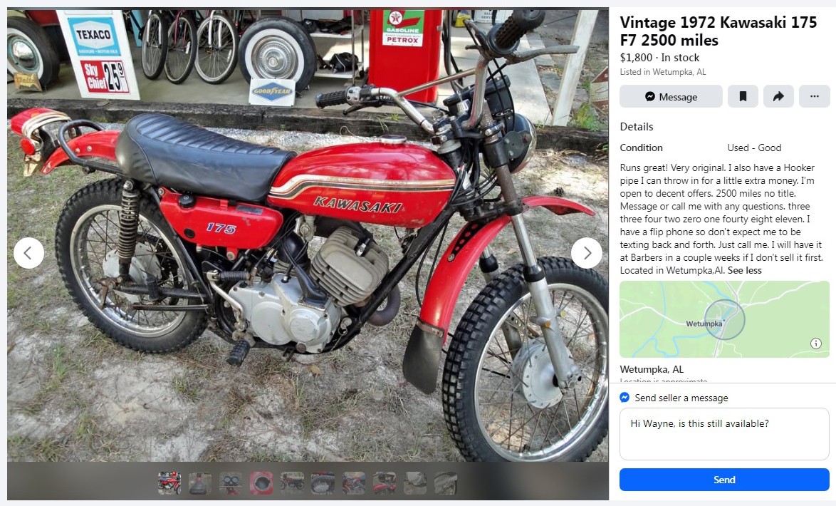 “From freeway to freedom” is how a Kawasaki brochure describes the lifestyle of owning a 1972 Kawasaki F7 175. I’d stick with back roads as much as possible, but maybe some short stints on a non-rush-hour-clogged freeway on your way to a gravel road somewhere would be ok. This low-mile survivor is listed here on Facebook Marketplace in Wetumpka, AL, and the seller is asking $1,800. Here is the original listing, and thanks to PRA4SNW for the tip!