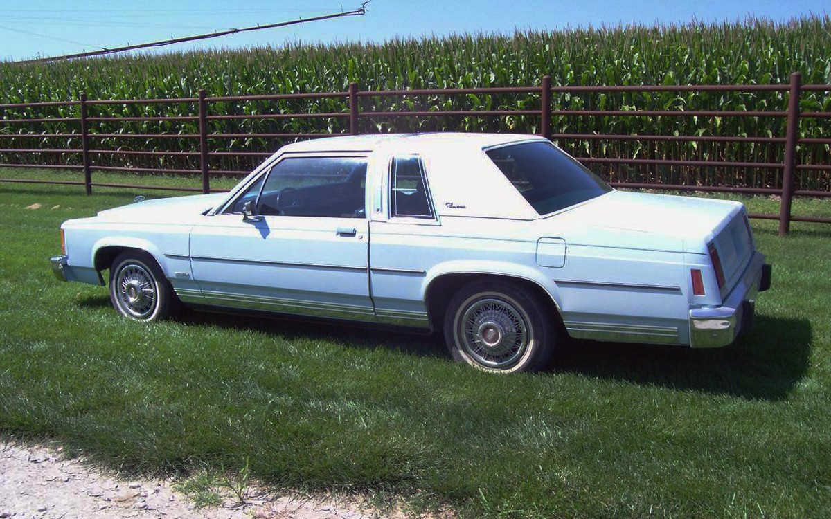I’m glad that they mentioned that this was a light blue car in the listing, I thought it was a white car with blue tones in the shadows. The photos are a little darker here than in the craigslist ad so you can see the color a little better. The Crown Victoria was Ford’s top trim level for the LTD in this era, beginning in 1980. These top models came with a padded top on the rear portion of the roof for two-door cars and the entire roof for four-door Crown Vics, although those had a band of trim from the bottom of the b-pillars and across the roof. Remember, there were still people wearing white shoes and belts in the early-1980s.
