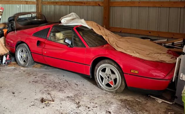 Now, my first reaction was that this looked a little too – I don’t know, perfect? The Ferrari sits on flat tires, yes, but it doesn’t seem to have the kind of filth that would be associated with barn storage for 20 years, as the listing claims. I tried to zoom in on the plate, as it appears to either be a temporary tag or perhaps a dealer plastic insert. Regardless, there are some pockets of dirt and the car cover is in tatters, but all of that can be manufactured if someone is desperate enough to cause a stir. Additionally, this looks like the backdrop of someone who trades in old C10 pickups and the occasional Harley; dropping a Ferrari 328 GTS into this setting seems awfully random.