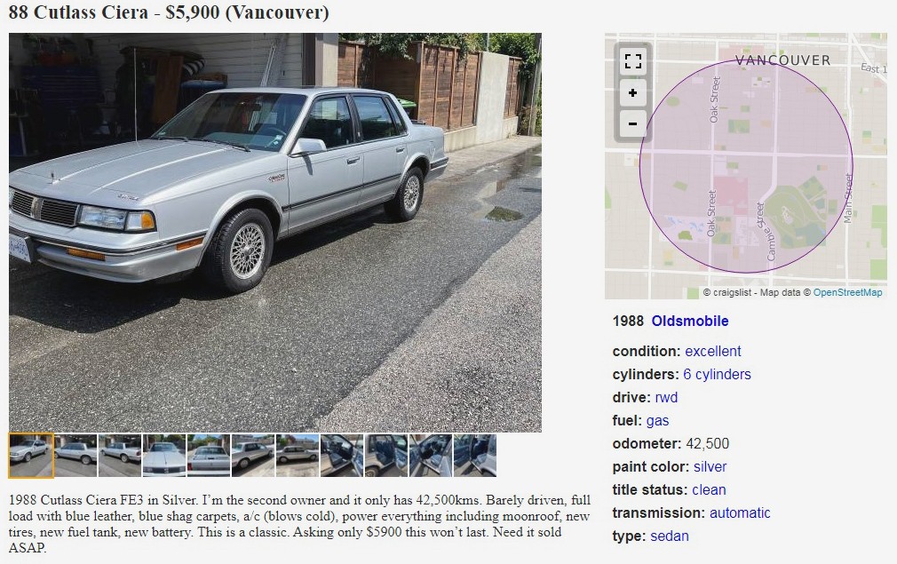 Another in the back-seat-looks-like-an-engine series, sadly, the seller didn’t bother to pop the hood for one lone engine photo. I believe this car would have GM’s 2.8-liter OHV V6, but a 3.8-liter V6 was optional. The seller just lists it as a 6-cylinder, but they also say rear-wheel drive, and this car is front-wheel drive, of course. It could have the 3.8 since it’s loaded in every other way, and that would have had 150 horsepower, a 25 hp bump from the 2.8. For $4,278 in U.S. dollars, this seems like a steal to me for a loaded car in such nice condition. Have any of you (in the U.S.) gotten a car in Canada and brought it back across the U.S. border?