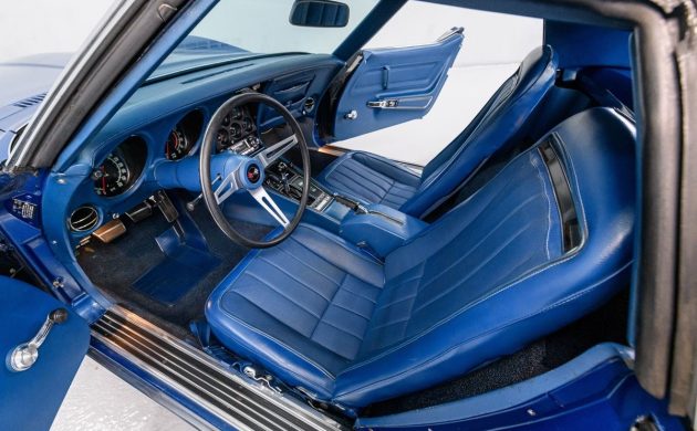 Buyers ordering a ’71 Corvette in Bridgehampton Blue could choose between Black or Dark Blue interior trim. This car’s first owner chose the latter in vinyl, and the condition is consistent with the odometer reading. The carpet shows typical age-related fading, but the upholstered surfaces are impressive. There is no significant wear, while the dash and pad are spotless. I always scrutinize the console when examining C3 Corvette interiors, because the area around the ashtray is particularly prone to scratches and other physical damage. However, this car’s console suggests it has always been treated respectfully. It isn’t loaded with factory options, but the AM/FM radio should provide effective in-car entertainment.