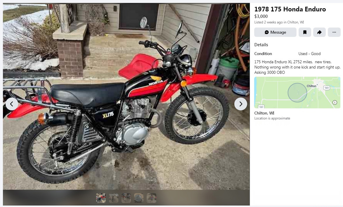 Excel Black and Tahitian Red is an interesting color combo for this on/off bike. It’s like a 14-horsepower red-winged blackbird, but with a little more bite than chirp. This low-mile 1978 Honda XL175 is listed here on Facebook Marketplace in Chilton, Wisconsin, and they’re asking $3,000 or best offer. Here is the original listing, and thanks to Lothar… of the Hill People for the tip!