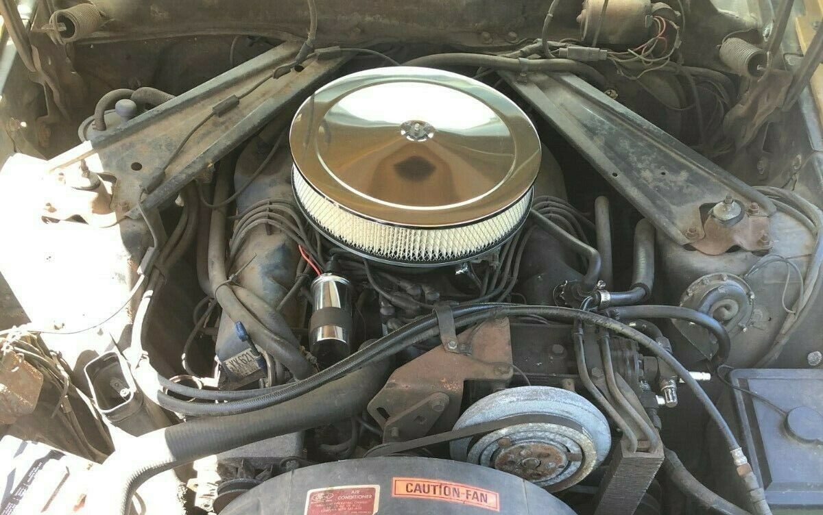 There are no full pictures of the interior but what stands out the most is the 4-speed shifter. The interior appears to be brown which does not really match the black striping on the exterior of the Mustang Mach 1. The dash is cracked and the interior looks to be sun-faded and brittle in places. The Mustang does have air conditioning which was not common in the early 1970s with a manually shifted car.